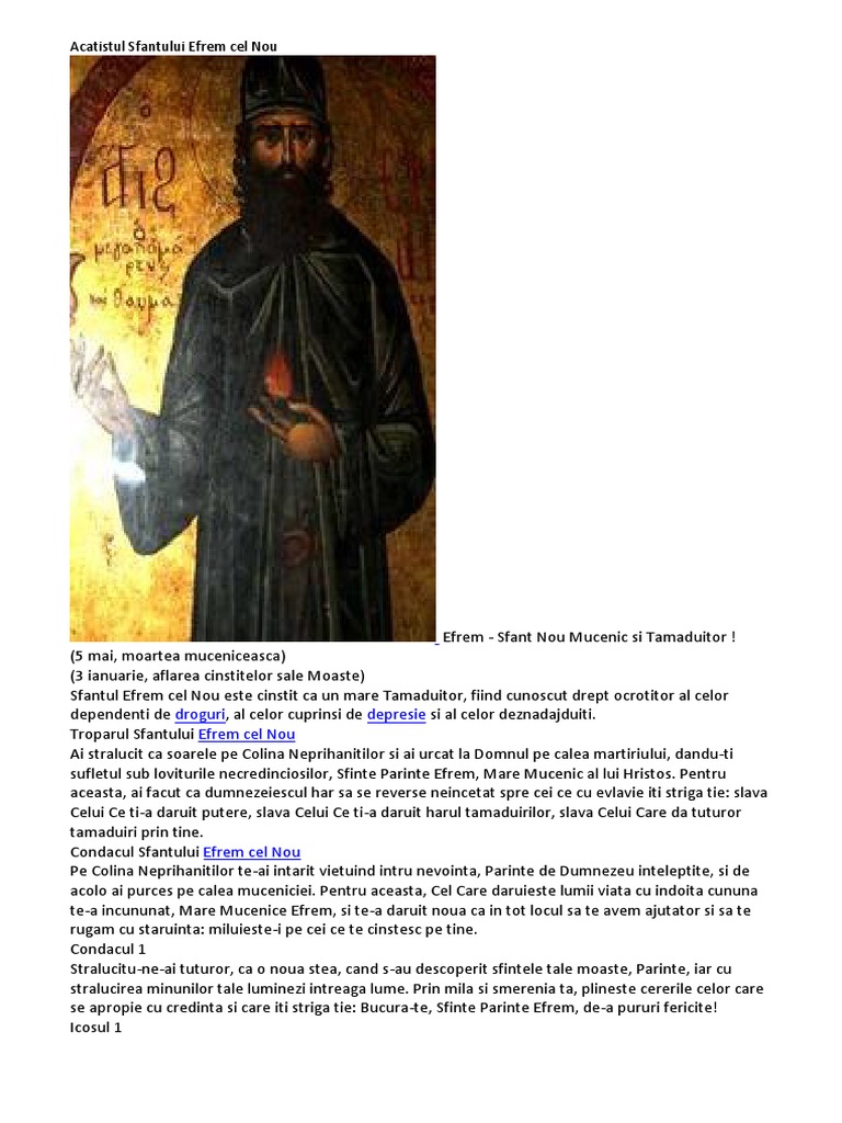 Efrem cel nou , sfant nou mucenic si tamaduitor 5 mai, moartea muceniceasca/3 ianuarie, aflarea cinstitelor sale moaste sa. Sfântul efrem cel nou este cinstit ca un mare tămăduitor, fiind cunoscut drept ocrotitor al celor dependenți de droguri, al celor cuprinși de depresie și al celor deznădăjduiți. Trimitem gratuit, prin posta romana, acatistul sfantului efrem cel nou, persoanelor din tara si strainatate care doresc sa se roage la acest mare sfant. Sfântul și preacuviosul părintele nostru efrem sirul a fost un prolific scriitor de. Paraclisul si acatistul sfantului efrem cel nou.