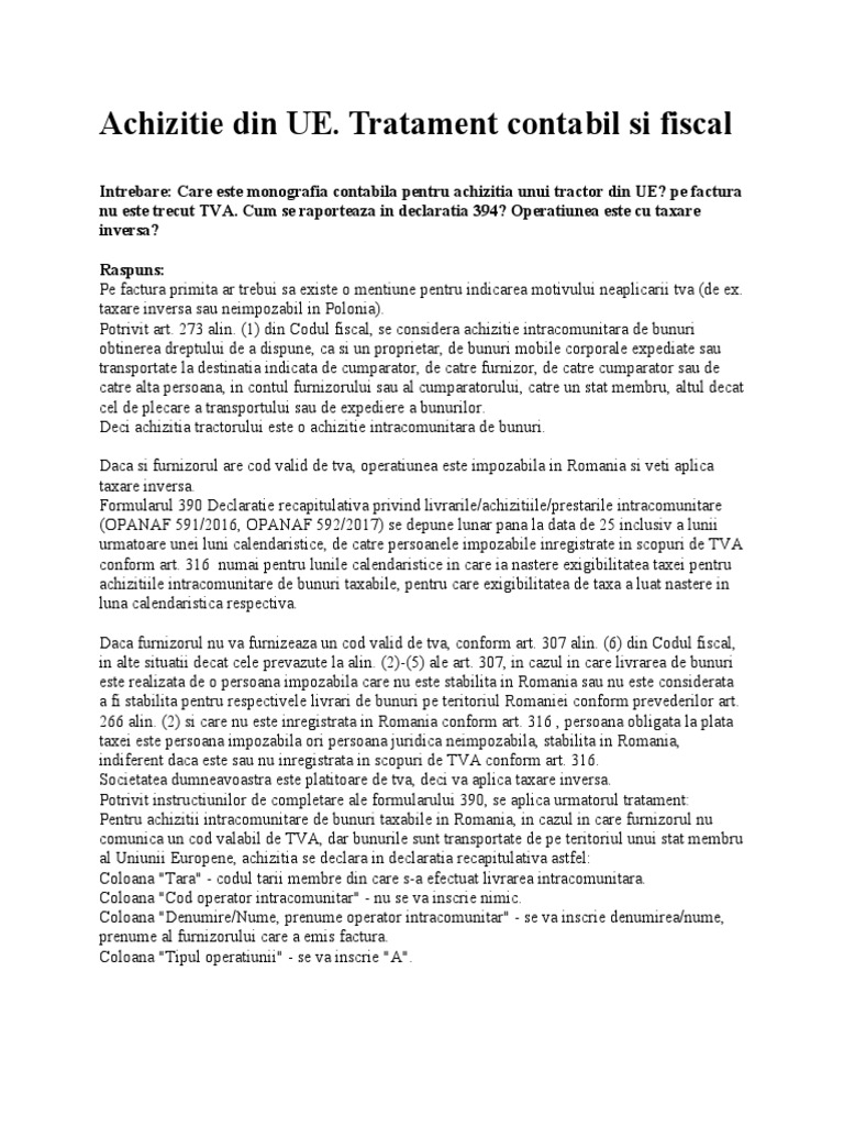 2133 = 404 nu am trecut achizitia in dec.390. Totuşi, dacă persoana impozabilă intenţionează să efectueze achiziţii intracomunitare de… un agent economic, avand ca obiect de activitate comerţul cu amănuntul, scutit de taxă pe valoarea adăugată, dar înregistrat în scopuri de tva pentru achiziţii intracomunitare, conform art. Taxare inversa, achizitie intracomunitara, deducere tva.
